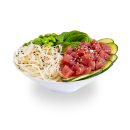 Savourez notre Poke Bowl Thon : un mélange délicieux de thon mariné, riz vinaigré, avocat, salade de chou, concombre, édamamé, rehaussé de sésame et d'une délicieuse sauce marinade.